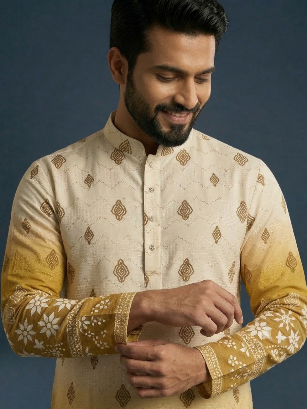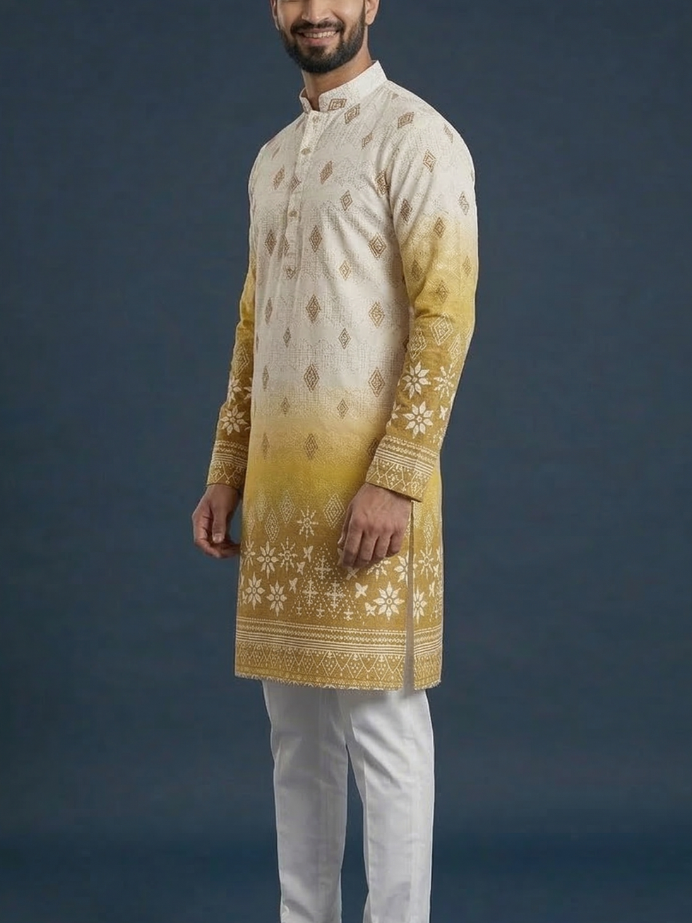 It features a striking ombre gradient that transitions seamlessly from a clean ivory top to a vibrant, sun-soaked mustard yellow. The upper section is detailed with minimalist geometric diamond motifs, while the lower half and sleeve cuffs are anchored by intricate floral and star-patterned embroidery, reminiscent of traditional artisanal craftsmanship. Designed with a classic mandarin collar and a refined button placket, this piece offers a sharp, regal silhouette. It’s the perfect choice for the modern man looking to make a sophisticated statement at weddings or festive celebrations.