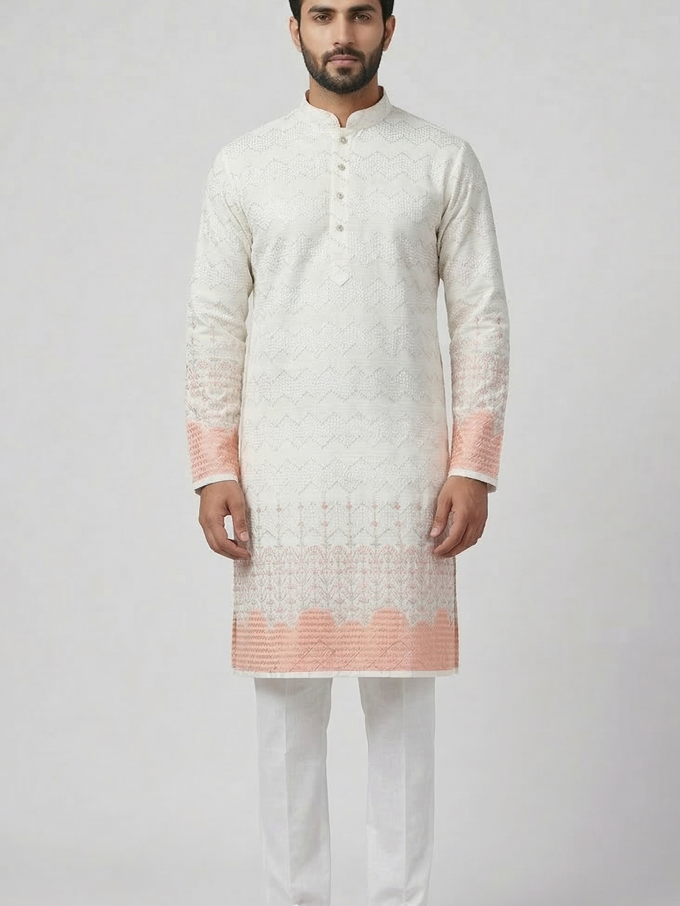 The most special part is the soft peach-coloured embroidery at the bottom and on the sleeve ends. This design looks like tiny flowers and vines growing upward. The very bottom edge has a pretty, wavy border that makes the outfit look unique and modern. It is a perfect choice for weddings or festivals because it looks very elegant and fresh.