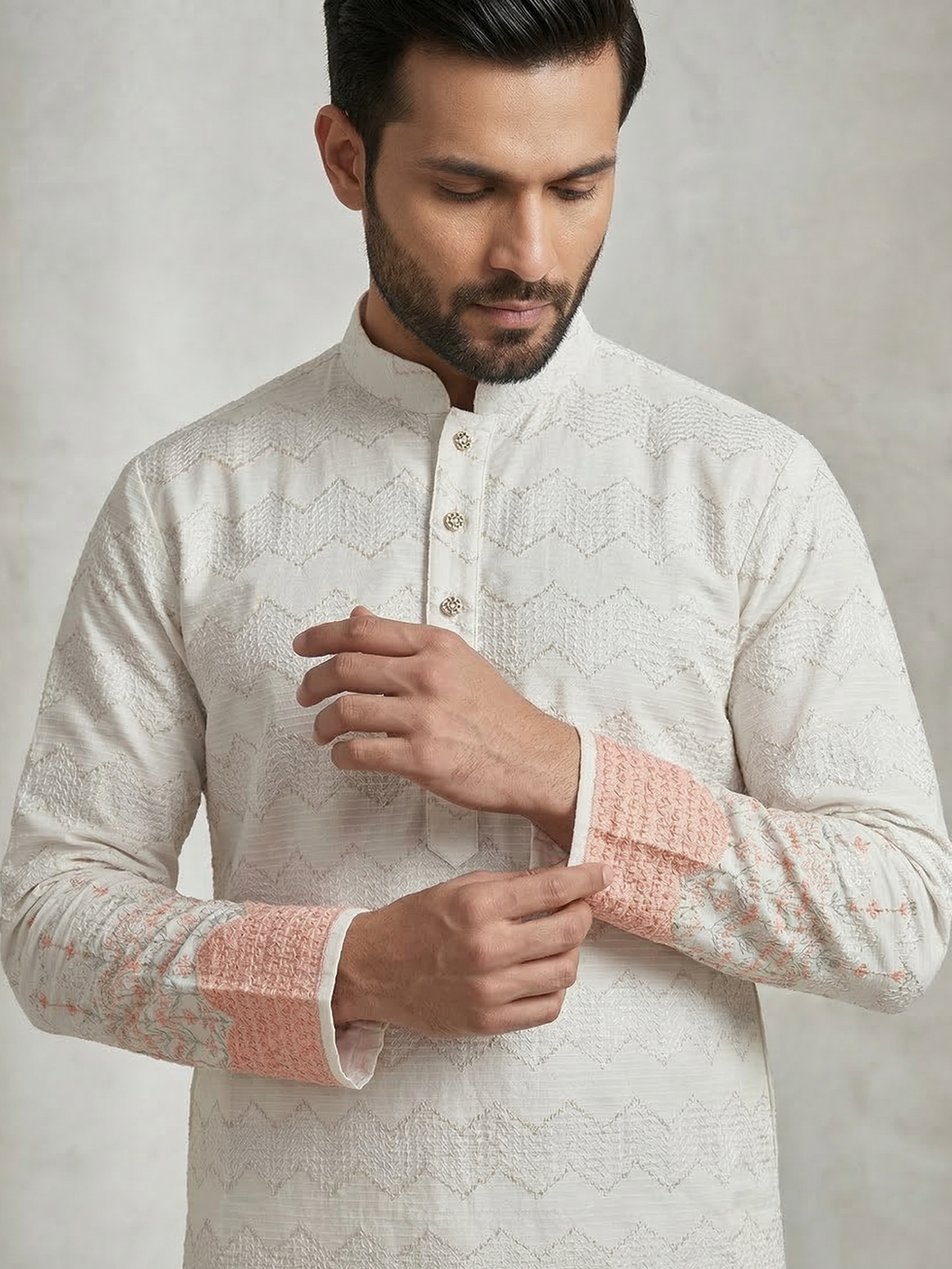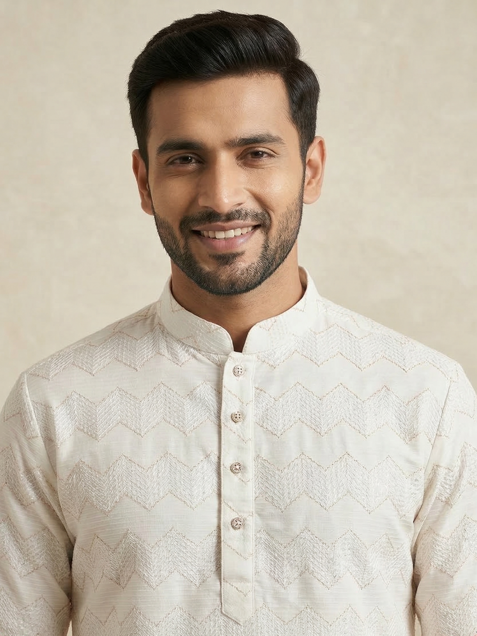 This is a beautiful off-white kurta with a subtle zigzag pattern woven into the fabric. It has a clean, stand-up collar and a row of buttons down the front.